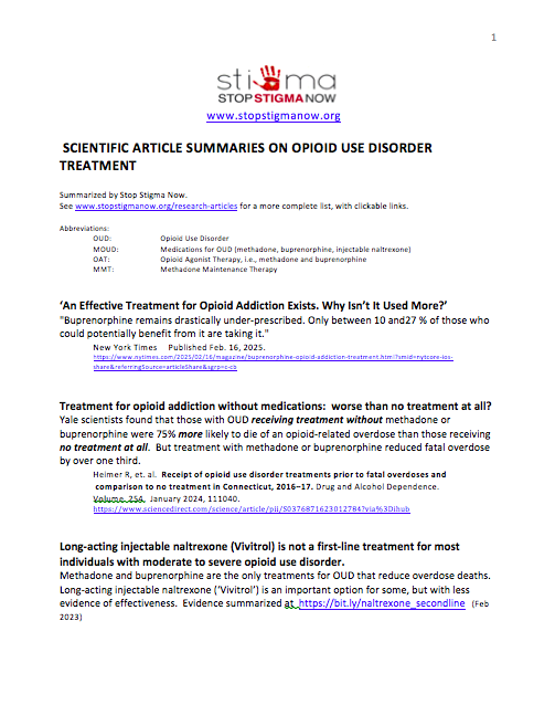 Scientific Articles 4 pgsby Stop Stigma Now Click HERE for the web version Med Treatment for OUD 1 pg. double-sidedby Stop Stigma Now Med Treatment for OUD 3 pgs double-sidedby Stop Stigma Now Injectable Naltrexone 2nd Line 1-pgby Stop Stigma Now Who We Areby Stop Stigma Now SSN BROCHURE 3-2023by Stop Stigma Now The Most Effective Treatment 2 pgsby Stop Stigma Now Words Matterby Stop Stigma Now SSN Bob Newmanby Stop Stigma Now If you would like hard copies of the brochures for an event in quantities of 25 or more and to order Stop Stigma Now buttons , please email info@stopstigmanow.org. Make a donation of $100 or more and receive a complementary t-shirt.